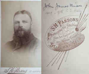 1. Election: Stood for office in the Assembly running against Michael Cashin but lost.: Aquaforte, Newfoundland and Labrador, Canada. 638 2. Alt. Christening, 11 Oct 1849, Aquaforte, Newfoundland and Labrador, Canada. 318 3. Minister/Priest: H. H. Hamilton, 9 Nov 1849, Ferryland, Newfoundland and Labrador, Canada. 54,190,191 4. Membership: Inducted as a member of the St. John's Lodge, Freemasons, 1875, St. John's, Newfoundland and Labrador, Canada. 637 John James Winser 5. Residence, 12 May 1880, Aquaforte, Newfoundland and Labrador, Canada. 629 6. Property: Ferryland - on road to Aquaforte, 23 Apr 1890, Aquaforte, Newfoundland and Labrador, Canada. 639 Winsor 7. Occupation: Agent for A. Goodridge & Son, 1898, Ferryland, Newfoundland and Labrador, Canada. 307 From "A Study of the Settlement of Ferryland" by Sister Esther Moore at the MHA we learn that "John Winsor, who was an agent for A. Goodridgeg & Son. A little cash was received by the men from the merchants in return for stakes and longers for the fish flakes." Despite the different spelling of the surname, I'm sure this is the person to whom she refers. Her Source - Dictionary of Canadian Biography by George Browne, Vol I P 672 8. Residence: 27 Victoria St, Dec 1907, St. John's, Newfoundland and Labrador, Canada. 633 This event was shared with Clara Isabella MORRY. 9. Will, 1 Apr 1908, St. John's, Newfoundland and Labrador, Canada. 318 10. Residence: Monkstown Rd, 11 Jan 1918, St. John's, Newfoundland and Labrador, Canada. 640 John married Clara Isabella MORRY, daughter of John Henry MORRY and Elizabeth Sarah WINSOR, on 12 May 1880 in Ferryland, Newfoundland and Labrador, Canada 313,417.,629 (Clara Isabella MORRY was born on 22 May 1854 in Ferryland, Newfoundland and Labrador, Canada 54,185,189,190,432, christened on 29 Oct 1854 in Ferryland, Newfoundland and Labrador, Canada,47,189,190,432 died on 28 Nov 1931 in St. John's, Newfoundland and Labrador, Canada 630 and was buried on 30 Nov 1931 in St. John's, Newfoundland and Labrador, Canada 631.). The cause of her death was Myocarditis.
