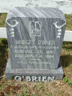 1. Alt. Birth, Aug 1886, Trepassey, Newfoundland and Labrador, Canada. 33,2165 2. Alt. Death, Cir 1984, Cape Broyle, Newfoundland and Labrador, Canada. 2165 Bridget married William Joseph O'BRIEN, son of William O'BRIEN and Ellen O'BRIEN. (William Joseph O'BRIEN was born on 4 Mar 1880 in Cape Broyle, Newfoundland and Labrador, Canada,6510,6511 died on 15 Sep 1971 in Cape Broyle, Newfoundland and Labrador, Canada 6511 and was buried after 15 Sep 1971 in Cape Broyle, Newfoundland and Labrador, Canada 6511.) |
