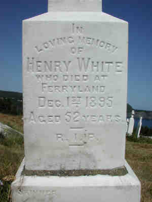 1. Occupation: Business owner, Northside: Ferryland, Newfoundland and Labrador, Canada. 1808 2. Alt. Birth, 1844, Ferryland, Newfoundland and Labrador, Canada. 3. Court: Indenture conveying all his personal property to brother Alfred, 15 Jan 1879, Ferryland, Newfoundland and Labrador, Canada. 1809 Done "In Trust" to protect his wife Margaret from having their personal possessions seized by potential business creditors. This event was shared with Alfred WHITE and Margaret O'DRISCOLL. 4. Court: Indenture "gifting" all his property to wife Catherine and son John Henry, 14 Dec 1883, Ferryland, Newfoundland and Labrador, Canada. 309 A photocopy of this "dee of gift" is also found in the suitcase containing Aunt Phyl's memorabilia which Fredi Caines is holding onto. This event was shared from John William WHITE who also shared it with Catherine O'SULLIVAN (Party). 5. Occupation: Returning Officer, Bef 1895, Ferryland, Newfoundland and Labrador, Canada. 763 Richard married Margaret O'DRISCOLL, daughter of Michael O'DRISCOLL and Ann HYNES, on 27 Jan 1872 in Ferryland, Newfoundland and Labrador, Canada.129 (Margaret O'DRISCOLL was born circa 1851 in Mobile, Newfoundland and Labrador, Canada,129,2937 died on 5 Mar 1935 in St. John's, Newfoundland and Labrador, Canada 2937 and was buried after 5 Mar 1935 in Ferryland, Newfoundland and Labrador, Canada 2937.)
