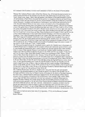 Vol. 6, Page 149 Mrs. Catherine Weston's daughter, namely Catherine Weston the younger was married to late William Carter. This recorded property of Mrs. Weston's came to his possession by her marriage. Shea( Mary) tenant to Richard Nason by the Decrees 1763 appears in Number 2------ admitted in this record of Catherine Weston , Mother-in law of late William Carter, father of Peter, Robert and Arthur Carter of Saint John's and Ferryland Nason, Benger and Double were one family by marriage and who lived together. Nason survived after Benger'' death and Double leaving the country 1776 in holding agents over said property to Nason's death 1825 Remark said Robert Carter was tenant to Richard Nason 1763 three years before this record was executed his sons William Carter was married to one of Mrs. Weston's daughters. This record shows no more than the premises on the beech with Carneys meadows there recorded in their possession with provisoes and holdings ??? be held only during his Majesty's pleasure and further not to prevent the fishery in its prosecution by the holding of said premises now in possession of late William Carter's family By Command of His Excellency Governor and Commander in Chief over the Island of Newfoundland. Whereas Mrs. Catherine Weston widow of late Peter Weston, Esq. of Ferryland deceased presented me a petition setting forth that her late husband was at the time of his death seized of several houses, stores, wharfs, fishing rooms, stages , flakes, fields and gardens in the Harbour of Ferryland aforesaid by the last will and testament of Peter Weston deceased that she and her two daughters,Catherine and Sarah Weston, were made co-heirs and joint executors by the last will and testament stating that the Records of Ferryland wherein the grants , boundaries and descriptions of said property were inserted been destroyed by fire in 1740, that said Catherine Weston do now cause a survey to be taken by five of the inhabitants of this Harbour showing the situations limits of boundaries of her late husband's property, That from the Northeast corner of the garden fence to Weston's dwelling house high water mark 1673 feet, E and S to W by N from NE corner of the garden bounded by foot path to Weston's house where he now live to high water mark 102 feet S by W, E by N from end of new house towards Mary Shea's dwelling house and high water mark 102 feet S by W and E by N of new house and Mary Shea's dwelling house by footpath 39 feet E and W from the corner of said dwelling house to the Coopers Shop formerly belonging to one Giles now rented by Mr. Sweetland 19 feet N and S bounded by the path to the Coopers Shop high water mark 22 feet North of Mary Shea's stage and Sweetland's wharf South corner of Sweetland's store bounded by the corner of Weston's store S W side of path passing between said store and Mr. Double's store 136 ½ feet N and S bounded by footpath East of red store to high water mark 88 feet including the footpath of 6 feet N. E and SW bounded by the side of William Double's store breadth of Sweetland's stage from corner to corner 35 feet long by 124 the vacant spot 37 feet ,3 inches breadth. NB. The ground bounded between Mr. Sweetland's store to path by Mr. Double's store is the property of Catherine Weston and two daughters with the exception of those parts mentioned carries its front to water by same breadth and measurement back to beech in length from side path opposite Mary Shea's dwelling house to corner of flake opposite Weston's Cook Room next Nicholas Audley's dwellings to corner of meadow next Allen the Smith's bounded by the path 216 feet WSW and ENE next meadow 75 feet S by E and N by W corner of Mary Shea's flake formerly Tucker's now in possession of Mrs. Weston 114 feet corner of Mary Shea's flake the beech to Mrs. Westons 150 feet NE and SW next end of beech 96 feet known by Tucker's next the meadows by E by W with small corner next to Sweetland's flake to the end of Double's flake 36 feet from the last measured place to the end of Sweetland and Tucker's flakes 228 feet SW by SE next Shea's flake 150 feet SW and NE the small flake joining the Flag Staff Room to corner of red store 150 feet opposite Double's store 30 feet NE and SW breadth 18 feet NE next Double's store the meadow length from corner of flake to Allen the Smiths and John Carney's dwelling 94 feet bearing as follows 67 feet WSW and ENE 139 feet WNW and ENE 96 feet W 254 feet WSW to ENE 96 feet W and E 254 feet ENE 90 feet SSW to NNE 294 feet to the side fence bounded by Admiral's Beech length 296 feet bearing E by S and W by N the end fence 24 feet NW by SE. Mrs. Catherine Weston prays she and two daughters that I may grant them the quiet and peaceable enjoyment of the aforesaid premises as I have caused an enquiry to be made by John Burndell, Esq my Surrogate and Robert Carter, Esq, his Majesty's justice of the peace for the district of Ferryland respecting the truth of Mrs. Catherine Weston's memorial as regards the last will and testament of Peter Weston deceased with the situation of boundaries of the several houses, stores, gardens, fields, wharfs, fishing rooms, stages and flakes above mentioned to be true I give and grant to Catherine Weston and two daughters the elder Catherine, the younger Sarah the quiet and peaceable possession of all the above mentioned premises agreeable to the last will of Peter Weston during his Majesty's Royal Will and pleasure and strictly forbids any persons, their heirs, and leans, Administrators or assignees provided it must be decreed and understood as relates the fishery it cannot be held longer than a particular time by act of Parliament made 10 th and 11 th year of King William the Third entitled an Act to encourage the Trade of Newfoundland. That the fishing works be kept in good proper condition at all times in the persecution of the fishery. Given under my hand and seal in Saint John's 26 th September, 1776 by his Excellencies Command J. Mont